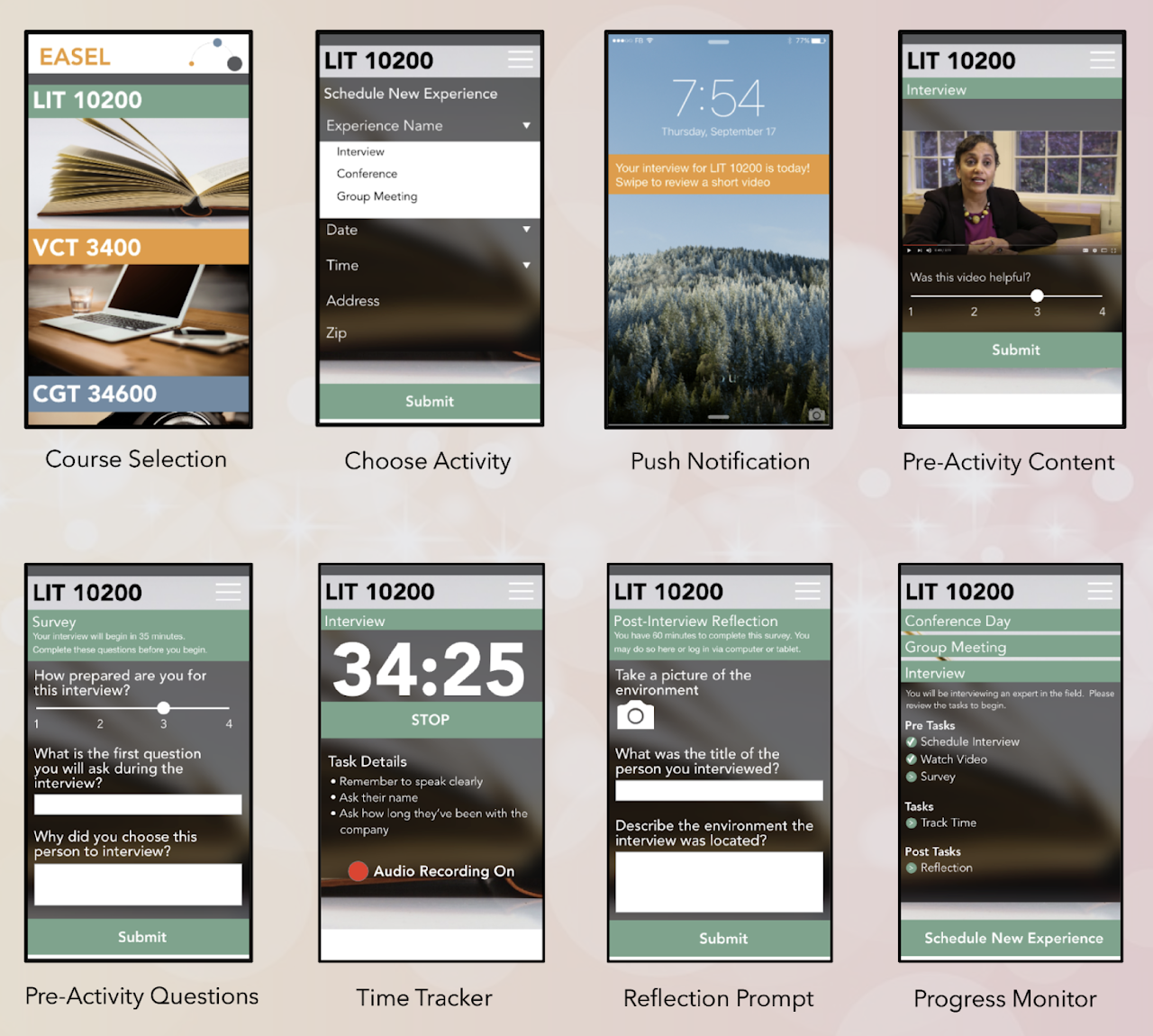 EASEL (Education through Application-Supported Experiential Learning) is a mobile platform that allows instructors to deliver reflection prompts and content before, during, and/or after a learning experience. It puts direct contact between the student and instructor at the core of the learning environment. The EASEL platform leverages the inherent functionality of mobile devices such as GPS and persistent network connectivity to adapt the learning environment based on location or time. Reflection prompts are triggered based on time or location. EASEL facilitates multiple input modalities such as text, voice recording, photography and video – offering students convenient choices to record their reflections.