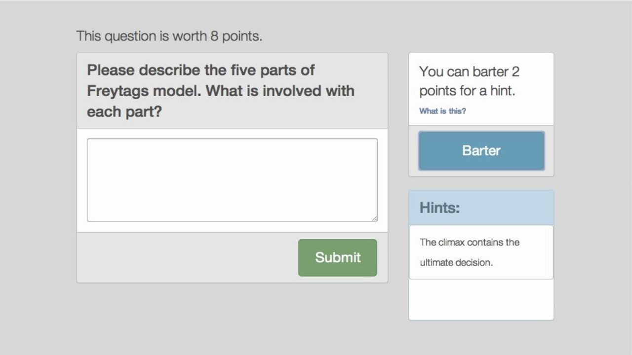 Point Barter’s key feature is similar to an important element of strategy games. It gives students the option to trade something of value - quiz points - for information that leads to the achievement of a goal - a correct answer. More importantly, it reinforces that there are multiple paths to success. A testing system that allows students to draw on outside information promotes ingenuity and strategy.
